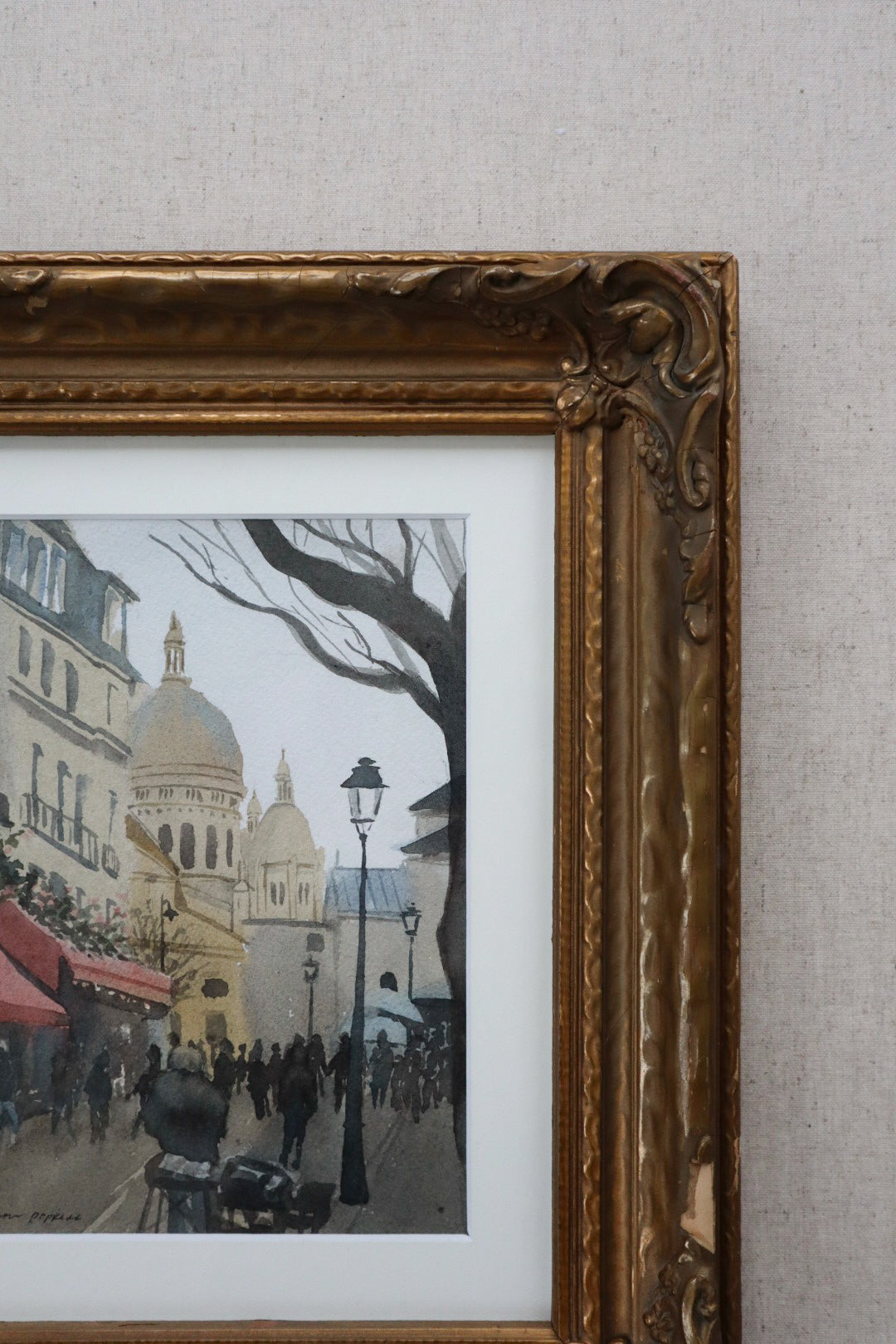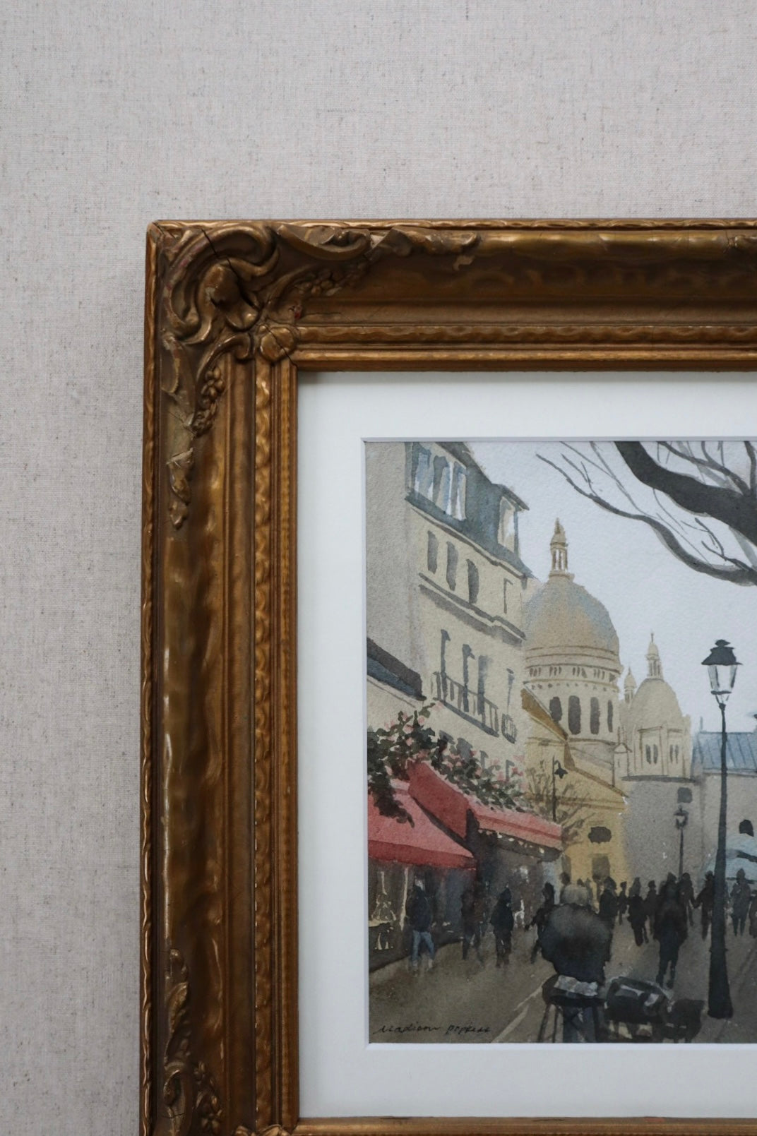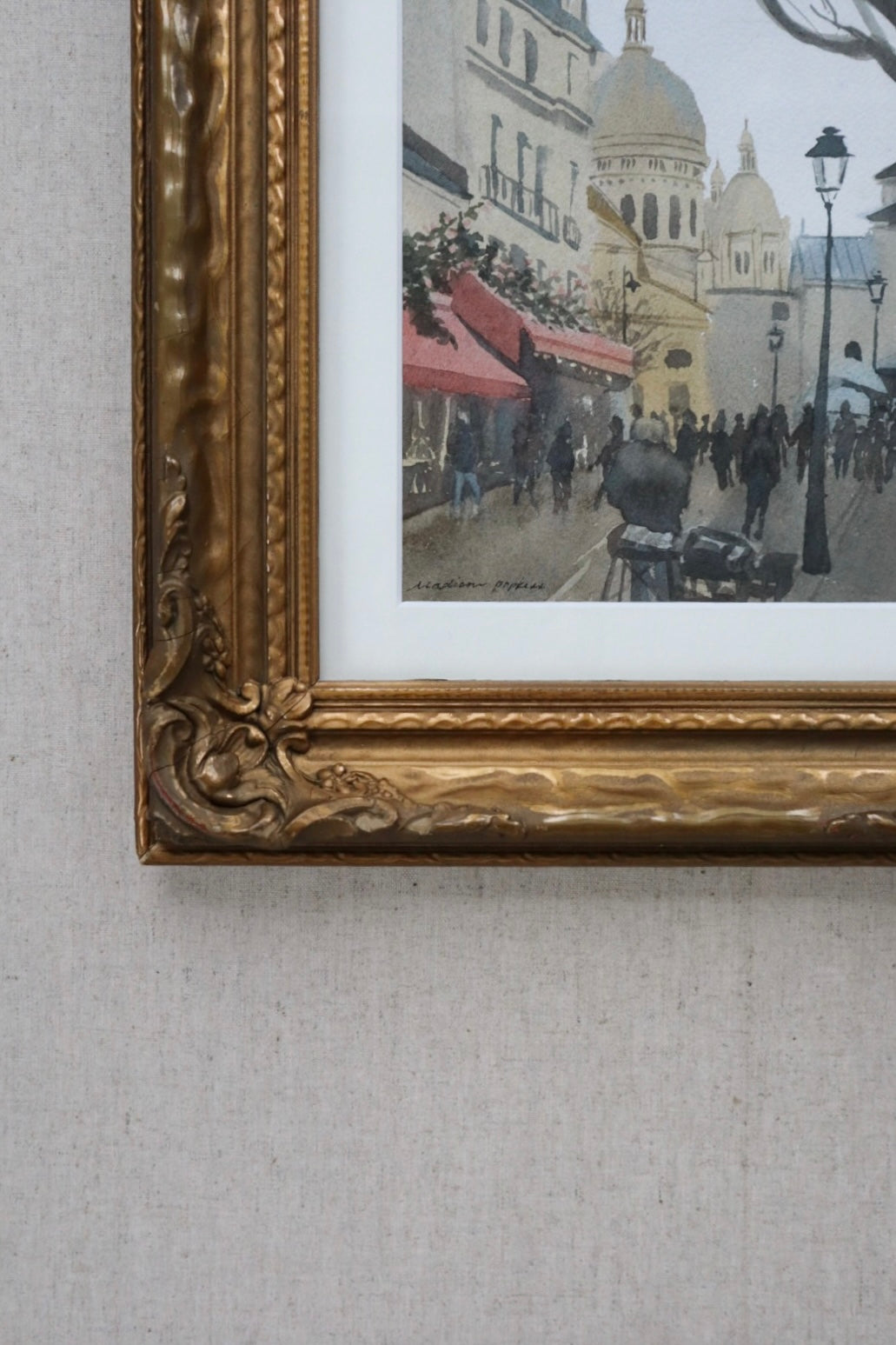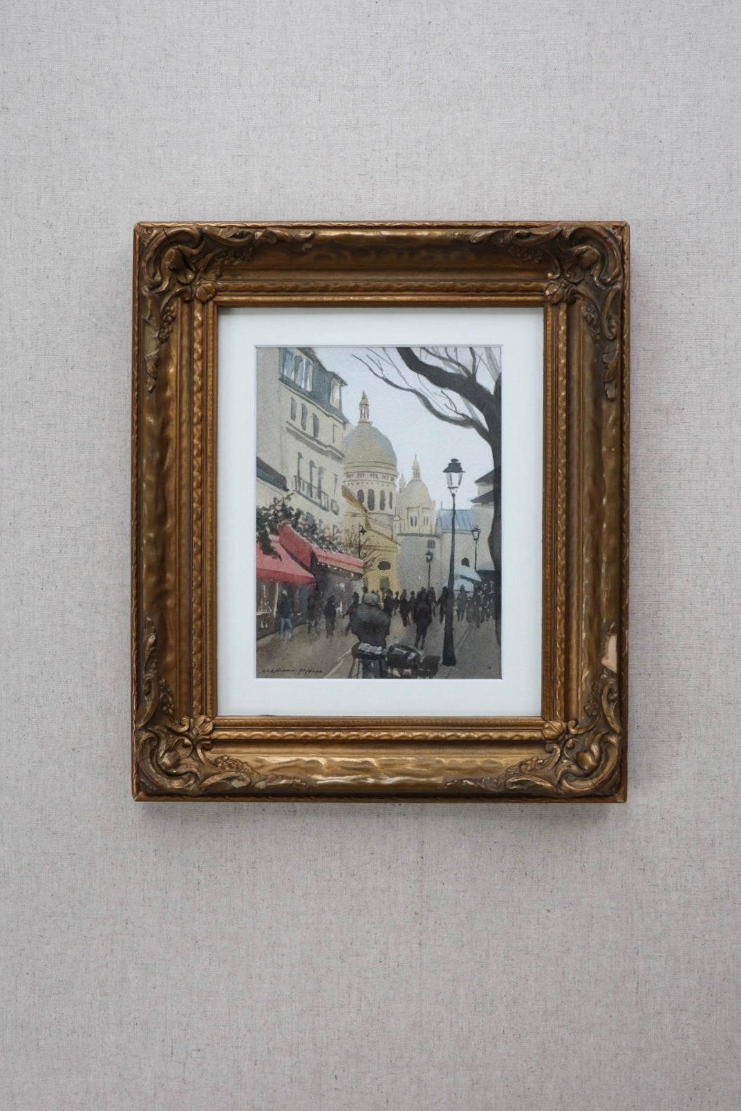 Original watercolor painting matted in off-white, framed in one-of-a-kind wooden vintage frame with glazing.